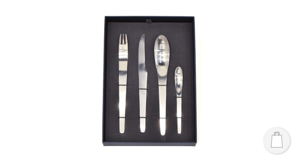 まず出てきたのは、カトラリー。デンマークの建築家アルネ・ヤコブセンが1957年にデザインしたもので、フォーク、ナイフ、スプーン、デザートスプーンの4ピースのセット。「フォークなんかは妖怪のいったんもめんみたいな形にも見えますね」と倉本さんが言うように、頭からそのまま柄に繋がる、おばけのようなシェイプは愛らしいけれど、でもひょっとして使いにくいかも?