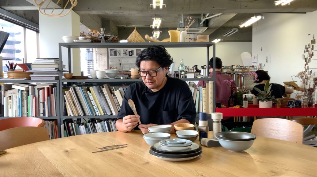 テーブルウエアが続くのは、実はこれら、オフィスでいつも使っているもの、とのこと。毎週金曜日のお昼は、スタッフが一緒にご飯を食べるのだそう。そんなところで交わされるのは仕事の話ではなく、その時あった個人的なあれやこれやのトピックス。ヤコブセンのカトラリーもALONGU-明論具-も、使われて愛されているものたちです。