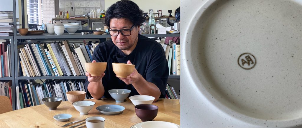 お次は食器シリーズ「ALONGU-明論具-」。こちらは倉本さんご自身のデザイン。長崎県波佐見で作る陶器のシリーズです。釉薬や焼き方の違いで、ヤキシメ、フチサビ、セイジ、テンモクの4種類があり、平皿がサイズ4種、茶碗、湯呑みがサイズ2種、鉢が2種、また木製の汁椀が色違いで2種揃っています。