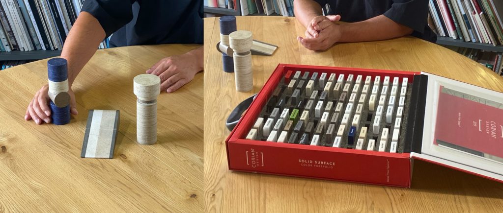 「最初からバラバラのパーツを組み合わせる構成のデザインにしていて、隣り合わせは違う色に、という大まかなルールを決めてあります。あとはその時に加工する職人さんのセンスにデザインを委ねる。工場に届く様々な種類の材料を漏れなく使い切ることができるザインにしました。普段はほとんど建築資材に使われますが、素材としてもすごくきれいだと思うんですよね」