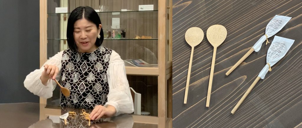 カレースプーンという名前ですが、私はお惣菜を取り分けるのに使ったり。デザートも食べられますし、丁度いいサイズ感なのですごく重宝しています。天然の竹は一つ一つ色や模様も違ってくるのもいいですよね。手ごろな値段なので家にストックしておいて、お土産にちょっと渡したりするのにも使っています。このつぼの包みのイラストは別府のお友だち、網中いづるさんの絵なんです」