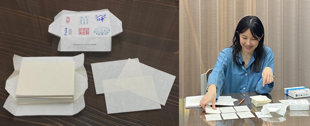 まず見せてくださったのは山梨県身延町、富士山のふもとで清らかな水を使い和紙作りを続ける「山叶製紙(やまかのせいし)」の小さな半紙のセットです。一般的な書道用の半紙の一束=一〆(ひとしめ)を1/9のサイズにしたミニチュア版。梱包のカバーも通常の半紙で使われるようにハンコの模様になっているのが愛らしい。
