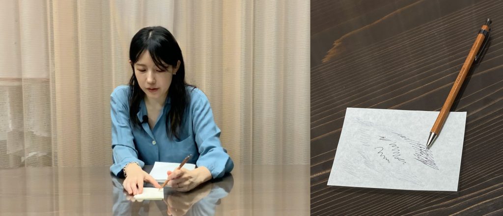 「軸が軽くて、細いし色も薄いので、ちょっと鉛筆みたいな感じのストロークが出ますね。普通はペンってインクがしっかり定着するものが多いと思うのですけど、ペンで書くほど定まっていない時とかにいい。鉛筆感覚ですね。でも鉛筆だと芯が丸くなっていって書き味が鈍くなっちゃう。このペンだと一定の細さと一定のシャープさが続くのですよね」