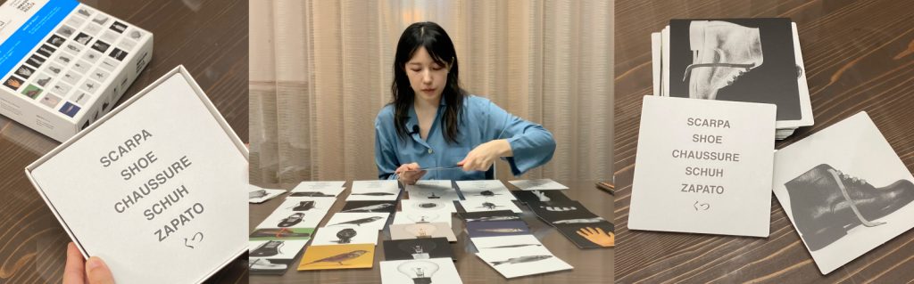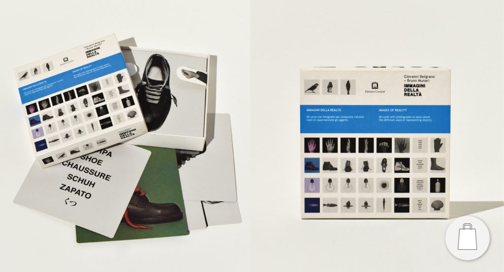 次はブルーノ・ムナーリの『現実世界のイメージ』です。15cm×15cmほどの大きさの、手、靴、電球、魚、鳥の写真のカードが入っています、というとなんだか簡単すぎる説明ですが、教育者でもあったブルーノ・ムナーリらしく、使い手の発想力を活かせるような余白があるところが魅力。